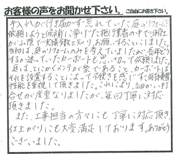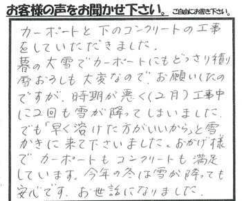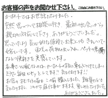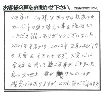カーポートではお世話になりました。突然思いついて相談に行き、最初の出会いから親切に対応して下さり、ありがとうございました。