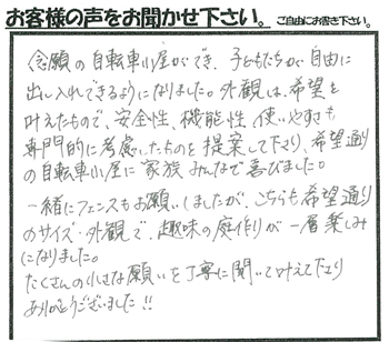 外観は希望を叶えたもので、安全性、機能性、使いやすさも専門的に考慮したものを提案して下さり、希望通りの自転車小屋に家族で喜びました。一緒にフェンスもお願いしましたが、こちらも希望通りのサイズ、外観で、趣味の庭作りが一層楽しみになりました。