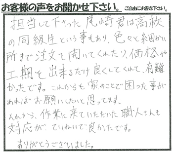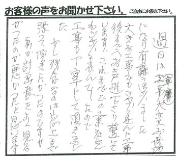 大きな工事でもございませんのに工事後までお声掛け下さり驚いています。これまでの業者さんもございませんでしたので、工事も丁寧にして頂きました。