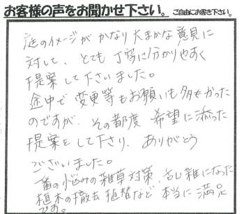 庭が完成し家族で早速野菜や花を植えたりベランダでくつろいだりして楽しんでいます。本当にありがとうございました。
