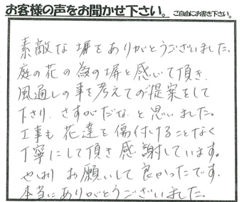 素敵な塀をありがとうございました。庭の花の為の塀と感じて頂き、風通しの事を考えての提案をして下さり、さすがだな。と思いました。