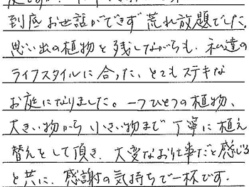 思い出の植物を残しながらも、私達のライフスタイルに合ったとてもステキなお庭になりました。