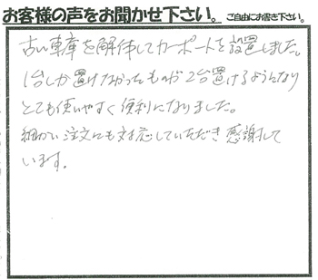 古い車庫を解体してカーポートを設置しました。1台しか置けなかったものが2台置けるようになり、とても使いやすく便利になりました。細かい注文にも対応して頂き感謝しています。