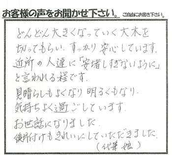 どんどん大きくなっていく大木を切ってもらい、すっかり安心しています。近所の人達に「安堵しすぎない様に」と言われる程です。見晴らしも良くなり明るくもなり、気持ち良く過ごしています。お世話になりました。後片付けも綺麗にしていただきました。