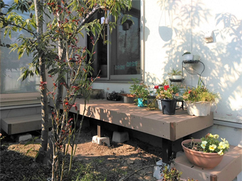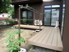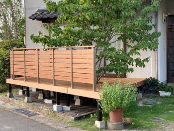 施工前には想像できなかったが、希望以上に良くなって、使用しやすい庭になったと喜んでおられます。テラス付のウッドデッキにした事で、手入れも楽になり、また、玄関側から見ても明るく広い空間が感じられる様になりました。