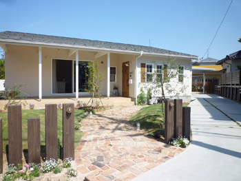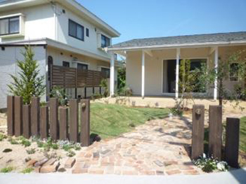 施工後の様子です。ナチュラルなお家に合わせて、枕木(ノーメンテナンスコンクリート製)を門柱にし、より一層ナチュラル感を出しました。 |