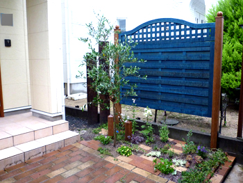 玄関先なので、ブルーでアクセントになるフェンスを提案させていただきました。 |