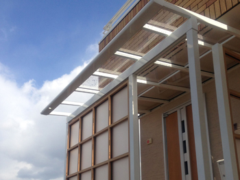 波板ストックルームは一番経済的に空間を作ることができます。自転車置場、物干し、ごみ置場などさまざまな用途に適しています。外壁の雰囲気を壊さないような色のチョイスが重要ですね。
