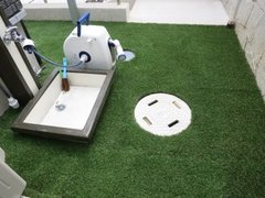 家の側面通路は土のままで雑草の管理が大変です。人工芝を敷くことで雑草も押さえ見た目もとても美しくなります。おすすめです。