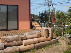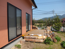 | 施工前です。テラスには屋根がなく、雨など天候の悪い日は外に出ることができませんでした。 | 丸太の木材がデザイン性に乏しく、見た目があまり良くありませんでした。 | 床の木材の継ぎ目は足場が不安定でした。 |
